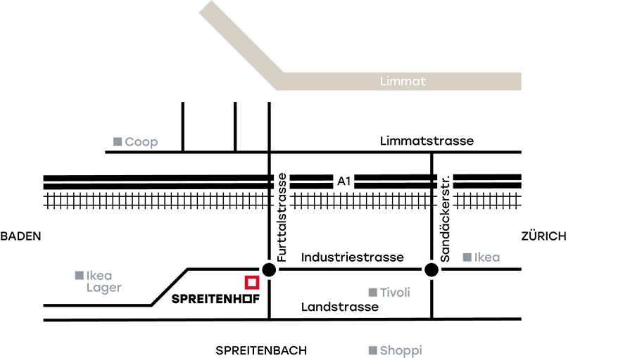Der Spreitenhof liegt im nördlichen Teil der Gemeinde Spreitenbach, im enorm boomenden Limmattal, am Tor zu Zürich und unweit des Wirtschaftszentrums Aarau. Das Gebäude verfügt über eine Parkgarage auf mehreren Stockwerken. Praktisch vor der Haustüre hält ab Mitte 2022 die Limmattalbahn, welche die Region mit der Zürcher City verbindet. Und den Autobahnzubringer A1 erreicht man in wenigen Fahrminuten. Echt praktisch: Im Spreitenhof ist man schnell hin und weg. Sei es mit den ÖV oder im Privatverkehr. Der Entscheid fürs Arbeiten im Spreitenhof ist naheliegend. Auch in puncto Verkehrsanbindung.